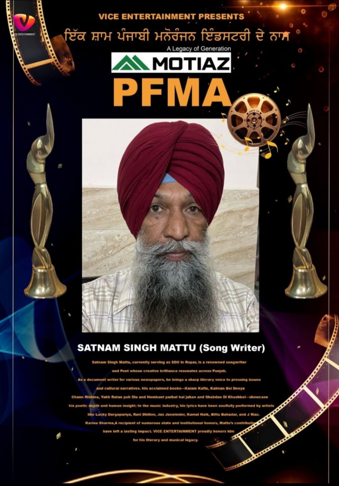 ਵਾਇਸ ਐਂਟਰਟੇਨਮੈਂਟ ਤੇ ਮੋਤੀਆ ਗਰੁੱਪ ਵਲੋਂ ਪਹਿਲੀ ਵਾਰ ਪਰੋਡਿਊਸਰ ਅਤੇ ਡਰਾਇਕੈਟਰ ਅਜੇ ਸਹੋਤਾ ਦੀ ਅਗਵਾਈ ਵਿੱਚ 24 ਮਈ ਹੋ ਰਹੇ ਫਿਲਮ ਐਂਡ ਮਿਊਜ਼ਿਕ ਐਵਾਰਡ ਸ਼ੋ ਵਿੱਚ ਜਲ ਸਪਲਾਈ ਅਤੇ ਸਪਲਾਈ ਵਿਭਾਗ ਵਿੱਚ ਬਤੌਰ ਉਪ ਮੰਡਲ ਇੰਜੀਨੀਅਰ ਸੇਵਾਵਾਂ ਨਿਭਾ ਰਹੇ ਇੰਜੀ. ਸਤਨਾਮ ਸਿੰਘ ਮੱਟੂ ਨੂੰ ਪੰਜਾਬ, ਪੰਜਾਬੀ ਅਤੇ ਪੰਜਾਬੀਅਤ ਲਈ ਗੀਤਾਂ, ਕਵਿਤਾਵਾਂ ਅਤੇ ਲੇਖਾਂ ਰਾਹੀ ਪਾਏ ਅਹਿਮ ਯੋਗਦਾਨ ਸਦਕਾ ਪਹਿਲੇ ਮੋਤੀਆ ਪੰਜਾਬੀ ਫਿਲਮ ਅਤੇ ਮਿਊਜ਼ਿਕ ਅਵਾਰਡ ਨਾਲ ਸਨਮਾਨਿਤ ਕੀਤਾ ਜਾ ਰਿਹਾ ਹੈ ।