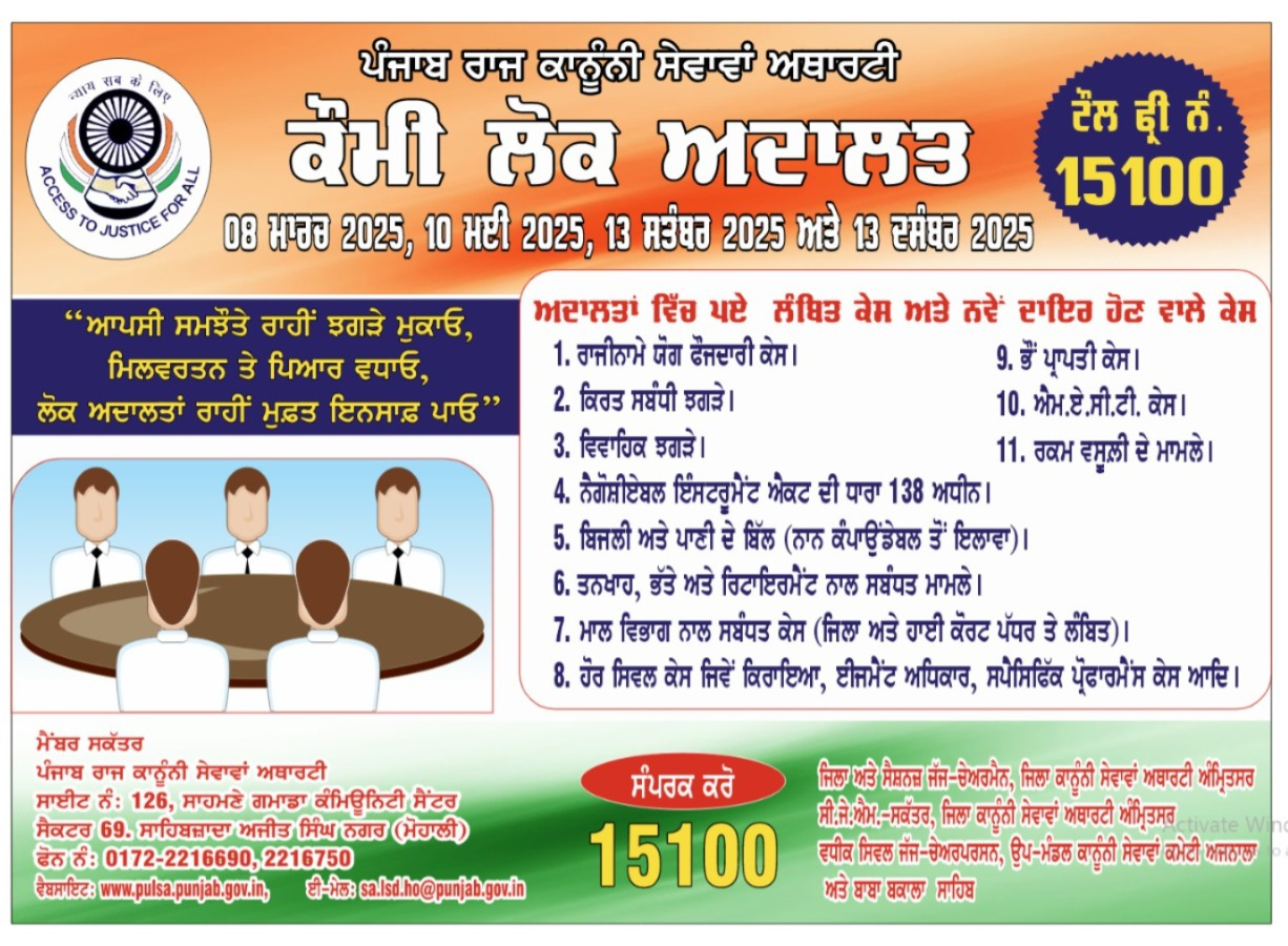 ਪੰਜਾਬ ਰਾਜ ਕਾਨੂੰਨੀ ਸੇਵਾਵਾਂ ਅਥਾਰਟੀ, ਐੱਸ.ਏ.ਐੱਸ ਨਗਰ, ਮੋਹਾਲੀ ਅਤੇ ਮਾਨਯੋਗ ਪੰਜਾਬ ਅਤੇ ਹਰਿਆਣਾ ਹਾਈ ਕੋਰਟ, ਚੰਡੀਗੜ੍ਹ ਜੀਆਂ ਦੀਆਂ ਹਦਾਇਤਾਂ ਅਨੁਸਾਰ ਸ੍ਰੀ ਅਮਰਿੰਦਰ ਸਿੰਘ ਗਰੇਵਾਲ, ਮਾਨਯੋਗ ਜਿਲ੍ਹਾ ਅਤੇ ਸੇਸ਼ਨਜ ਕਮ ਚੇਅਰਮੈਨ, ਜਿਲ੍ਹਾ ਕਾਨੂੰਨੀ ਸੇਵਾਵਾਂ ਅਥਾਰਟੀ, ਅੰਮ੍ਰਿਤਸਰ ਦੀ ਰਹਿਨੁਮਾਈ ਹੇਠ ਇਸ ਵਾਰ ਕੌਮੀ ਲੋਕ ਅਦਾਲਤ ਮਿਤੀ 10 ਮਈ 2025 ਦਿਨ ਸ਼ਨੀਵਾਰ ਨੂੰ ਲਗਣ ਜਾ ਰਹੀ ਹੈ।
