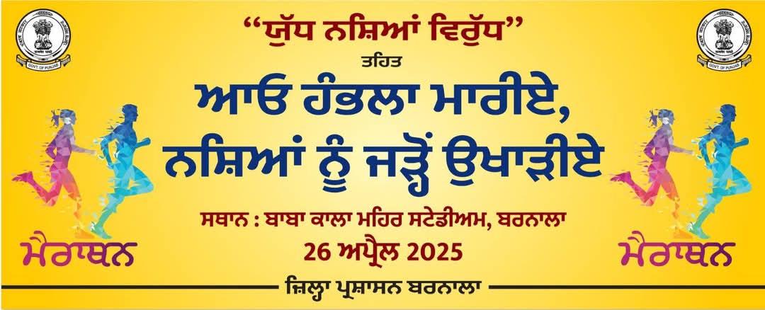 ਜ਼ਿਲ੍ਹਾ ਪ੍ਰਸ਼ਾਸਨ ਬਰਨਾਲਾ ਵਲੋਂ ਪੰਜਾਬ ਸਰਕਾਰ ਦੀ ਮੁਹਿੰਮ ‘ਯੁੱਧ ਨਸ਼ਿਆਂ ਵਿਰੁੱਧ’ ਤਹਿਤ 26 ਅਪ੍ਰੈਲ ਨੂੰ ਜ਼ਿਲ੍ਹਾ ਪੱਧਰ ‘ਤੇ ਮੈਰਾਥਨ ਕਾਰਵਾਈ ਜਾ ਰਹੀ ਹੈ।