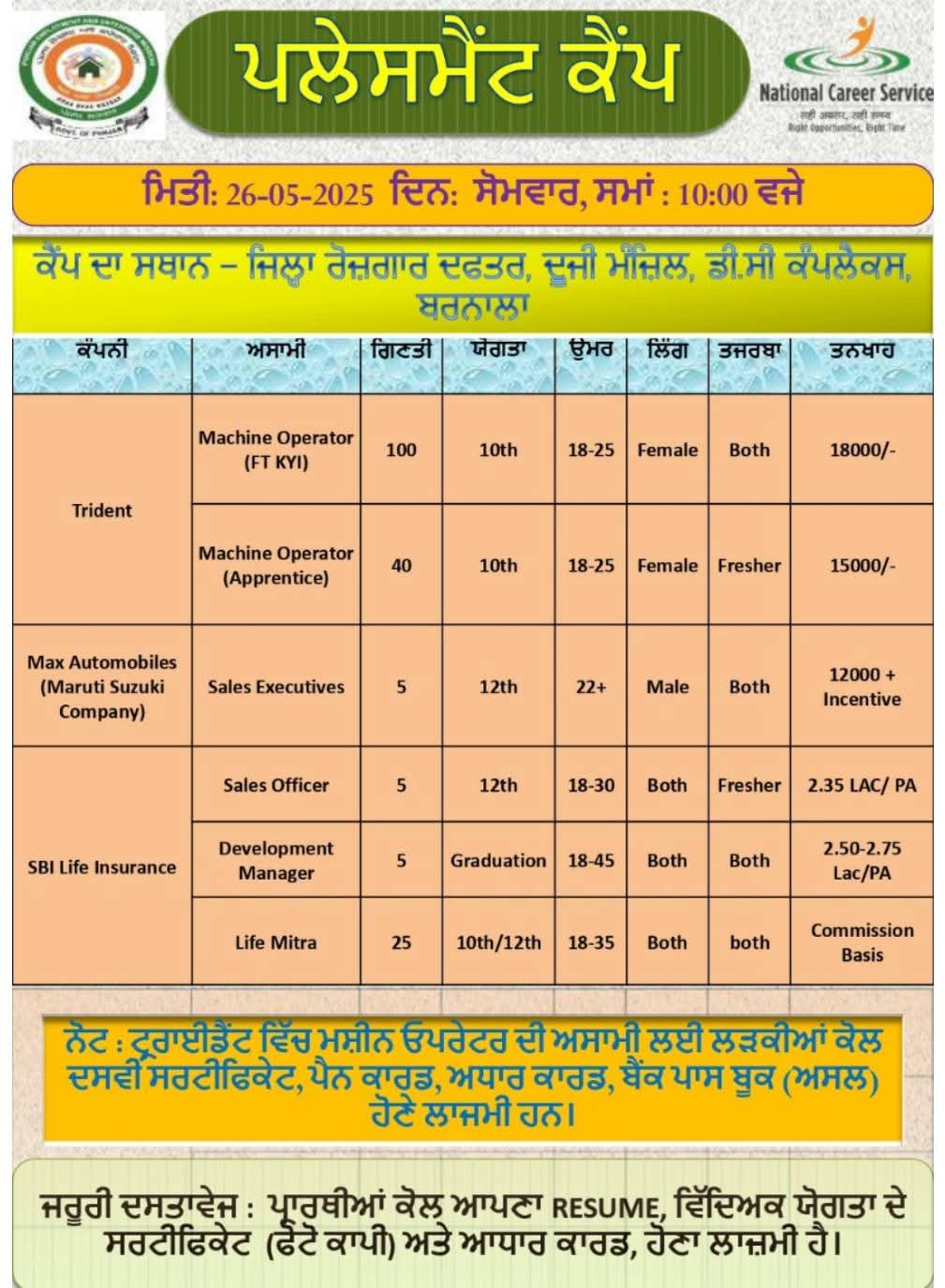 ਇਸ ਸਬੰਧੀ ਜ਼ਿਲ੍ਹਾ ਰੋਜ਼ਗਾਰ ਉਤਪਤੀ ਹੁਨਰ ਵਿਕਾਸ ਅਤੇ ਸਿਖਲਾਈ ਅਫਸਰ, ਬਰਨਾਲਾ ਸ਼੍ਰੀਮਤੀ ਨਵਜੋਤ ਕੌਰ ਨੇ ਦੱਸਿਆ ਕਿ ਟਰਾਈਡੈਂਟ, ਮੈਕਸ ਆਟੋ ਮੋਬਾਈਲਜ਼ (ਮਰੂਤੀ ਸਾਯੂਕੀ), ਐਸਬੀਆਈ ਲਾਈਫ ਇੰਸ਼ੋਰੈਂਸ ਆਦਿ ਕੰਪਨੀਆਂ ਨਾਲ ਤਾਲਮੇਲ ਕਰਕੇ 26 ਮਈ 2025 (ਦਿਨ ਦਿਨ ਸੋਮਵਾਰ ) ਨੂੰ ਸਵੇਰੇ 10:00 ਵਜੇ ਤੋਂ 02.00 ਵਜੇ ਤੱਕ ਜ਼ਿਲ੍ਹਾ ਰੋਜ਼ਗਾਰ ਅਤੇ ਕਾਰੋਬਾਰ ਬਿਊਰੋ ਬਰਨਾਲਾ, ਜ਼ਿਲ੍ਹਾ ਪ੍ਰਬੰਧਕੀ ਕੰਪਲੈਕਸ, ਦੂਸਰੀ ਮੰਜ਼ਿਲ, ਬਰਨਾਲਾ ਵਿਖੇ ਇਕ ਪਲੇਸਮੈਂਟ ਕੈਂਪ ਲਗਾਇਆ ਜਾ ਰਿਹਾ।