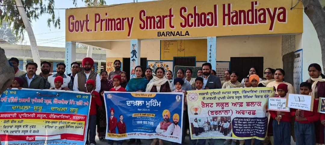 ਇਸ ਤਹਿਤ ਜ਼ਿਲ੍ਹਾ ਸਿੱਖਿਆ ਅਫ਼ਸਰ (ਸੈਕੰਡਰੀ) ਸਰੋਜ ਰਾਣੀ, ਜ਼ਿਲ੍ਹਾ ਸਿੱਖਿਆ ਅਫ਼ਸਰ (ਐਲੀਮੈਂਟਰੀ) ਭੁਪਿੰਦਰ ਕੌਰ, ਡਿਪਟੀ ਡੀ.ਈ.ਓਜ਼. ਵਸੁੰਧਰਾ ਕਪਿਲਾ, ਬਰਜਿੰਦਰਪਾਲ ਸਿੰਘ, ਡਾਈਟ ਪ੍ਰਿੰਸੀਪਲ ਡਾ. ਮੁਨੀਸ਼ ਮੋਹਨ ਸ਼ਰਮਾ ਅਤੇ ਬੀ.ਪੀ.ਈ.ਓ. ਹਰਿੰਦਰ ਬਰਾੜ ਦੀ ਅਗਵਾਈ ਹੇਠ ਪਿੰਡ ਹੰਡਿਆਇਆ ਦੇ ਸਰਕਾਰੀ ਸਕੂਲ ਤੋਂ ਬਰਨਾਲਾ ਬਲਾਕ ਲਈ ਦਾਖ਼ਲਾ ਮੁਹਿੰਮ ਦੀ ਸ਼ੁਰੂਆਤ ਕੀਤੀ ਗਈ।