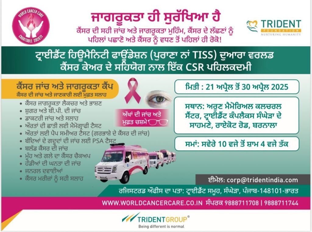 ਟਰਾਈਡੈਂਟ ਸਮੂਹ ਵੱਲੋਂ ਵਰਲਡ ਕੈਂਸਰ ਕੇਅਰ ਸੁਸਾਇਟੀ ਦੇ ਸਹਿਯੋਗ ਨਾਲ ਸੰਸਥਾਪਕ ਪਦਮ ਸ਼੍ਰੀ ਰਾਜਿੰਦਰ ਗੁਪਤਾ ਦੀ ਅਗਵਾਈ ਵਿੱਚ ਆਯੋਜਿਤ 10 ਦਿਨਾਂ ਦਾ ਕੈਂਸਰ ਜਾਗਰੂਕਤਾ ਕੈਂਪ ਬਹੁਤ ਸਫਲ ਰਿਹਾ। ਇਸ ਕੈਂਪ ਵਿੱਚ 6000 ਤੋਂ ਵੱਧ ਲੋਕਾਂ ਨੇ ਵੱਧ-ਚੜ੍ਹ ਕੇ ਹਿੱਸਾ ਲਿਆ। ਕੈਂਪ ਦਾ ਮੁੱਖ ਉਦੇਸ਼ ਲੋਕਾਂ ਨੂੰ ਕੈਂਸਰ ਬਾਰੇ ਜਾਣਕਾਰੀ ਦੇਣਾ, ਇਸ ਤੋਂ ਬਚਾਅ ਦੇ ਤਰੀਕਿਆਂ ਬਾਰੇ ਦੱਸਣਾ ਅਤੇ ਮੁਫ਼ਤ ਜਾਂਚਾਂ ਕਰਕੇ ਜਾਗਰੂਕਤਾ ਫੈਲਾਉਣਾ ਸੀ। ਕੈਂਪ ਦੀਆਂ ਮੁੱਖ ਗੱਲਾਂ: ਮੁਫ਼ਤ ਜਾਂਚਾਂ: ਕੈਂਪ ਵਿੱਚ ਔਰਤਾਂ ਲਈ ਛਾਤੀ ਅਤੇ ਬੱਚੇਦਾਨੀ ਦੇ ਕੈਂਸਰ ਦੀ ਜਾਂਚ, ਮੂੰਹ ਅਤੇ ਚਮੜੀ ਦੇ ਕੈਂਸਰ ਦੀ ਮੁਫ਼ਤ ਜਾਂਚ ਕੀਤੀ ਗਈ। ਮਾਹਿਰਾਂ ਦੀ ਸਲਾਹ: ਤਜਰਬੇਕਾਰ ਡਾਕਟਰਾਂ ਅਤੇ ਕੈਂਸਰ ਰੋਗਾਂ ਦੇ ਮਾਹਿਰਾਂ ਨੇ ਲੋਕਾਂ ਨੂੰ ਸਿੱਧੀ ਸਲਾਹ ਦਿੱਤੀ। ਜਾਗਰੂਕਤਾ ਲੈਕਚਰ: ਕੈਂਪ ਵਿੱਚ ਕੈਂਸਰ ਬਾਰੇ ਜਾਣਕਾਰੀ ਦੇਣ ਲਈ ਲੈਕਚਰ, ਸੈਸ਼ਨ ਅਤੇ ਵੀਡੀਓ ਦਿਖਾਈਆਂ ਗਈਆਂ। ਪ੍ਰੇਰਣਾਦਾਇਕ ਕਹਾਣੀਆਂ: ਕੈਂਸਰ ਤੋਂ ਠੀਕ ਹੋ ਚੁੱਕੇ ਲੋਕਾਂ ਨੇ ਆਪਣੀਆਂ ਕਹਾਣੀਆਂ ਸਾਂਝੀਆਂ ਕੀਤੀਆਂ ਅਤੇ ਮਾਨਸਿਕ ਸਹਾਇਤਾ ਲਈ ਸੈਸ਼ਨ ਵੀ ਆਯੋਜਿਤ ਕੀਤੇ ਗਏ। ਵਿਸ਼ੇਸ਼ ਧਿਆਨ: ਕੈਂਪ ਵਿੱਚ ਔਰਤਾਂ ਅਤੇ ਨੌਜਵਾਨਾਂ ਵਿੱਚ ਕੈਂਸਰ ਦੀ ਰੋਕਥਾਮ ‘ਤੇ ਵਿਸ਼ੇਸ਼ ਧਿਆਨ ਦਿੱਤਾ ਗਿਆ। ਇਹ ਕੈਂਪ ਟ੍ਰਾਈਡੈਂਟ ਦੇ ਕਾਰਪੋਰੇਟ ਸੋਸ਼ਲ ਰਿਸਪਾਂਸੀਬਿਲਟੀ (CSR) ਪ੍ਰੋਗਰਾਮ ਦਾ ਹਿੱਸਾ ਸੀ। ਇਸਦਾ ਉਦੇਸ਼ ਸਿਰਫ਼ ਬਿਮਾਰੀ ਦੀ ਜਾਂਚ ਕਰਨਾ ਹੀ ਨਹੀਂ, ਸਗੋਂ ਲੋਕਾਂ ਵਿੱਚ ਕੈਂਸਰ ਦੇ ਡਰ, ਭਰਮ ਅਤੇ ਇਸ ਬਾਰੇ ਚੁੱਪ ਰਹਿਣ ਦੀ ਪ੍ਰਵਿਰਤੀ ਨੂੰ ਦੂਰ ਕਰਨਾ ਵੀ ਸੀ। ਕੈਂਪ ਨੂੰ ਸਫਲ ਬਣਾਉਣ ਵਿੱਚ ਸਿਹਤ ਵਿਭਾਗ, ਸਥਾਨਕ ਗੈਰ-ਸਰਕਾਰੀ ਸੰਗਠਨਾਂ (NGOs) ਅਤੇ ਹਸਪਤਾਲਾਂ ਨੇ ਵੀ ਅਹਿਮ ਭੂਮਿਕਾ ਨਿਭਾਈ। ਟ੍ਰਾਈਡੈਂਟ ਦੇ CSR ਹੈੱਡ ਨੇ ਕਿਹਾ, “ਸਾਡਾ ਇਹ ਯਤਨ ਹੈ ਕਿ ਅਸੀਂ ਸਮਾਜ ਨੂੰ ਨਾ ਸਿਰਫ਼ ਰੁਜ਼ਗਾਰ ਦੇਈਏ, ਸਗੋਂ ਸਿਹਤ, ਸੁਰੱਖਿਆ ਅਤੇ ਜਾਗਰੂਕਤਾ ਰਾਹੀਂ ਇੱਕ ਸਵੱਛ ਅਤੇ ਸਿਹਤਮੰਦ ਭਵਿੱਖ ਵੀ ਦੇਈਏ। 6000 ਤੋਂ ਵੱਧ ਲੋਕਾਂ ਦੀ ਹਾਜ਼ਰੀ ਨੇ ਸਾਡੇ ਇਸ ਉਦੇਸ਼ ਨੂੰ ਹੋਰ ਮਜ਼ਬੂਤੀ ਦਿੱਤੀ ਹੈ। ਕੈਂਪ ਦੌਰਾਨ ਕਈ ਅਜਿਹੇ ਮਾਮਲੇ ਵੀ ਸਾਹਮਣੇ ਆਏ ਜਿਨ੍ਹਾਂ ਵਿੱਚ ਸ਼ੁਰੂਆਤੀ ਲੱਛਣਾਂ ਦੇ ਆਧਾਰ ‘ਤੇ ਲੋਕਾਂ ਨੂੰ ਸਲਾਹ ਦਿੱਤੀ ਗਈ ਅਤੇ ਉਨ੍ਹਾਂ ਨੂੰ ਅੱਗੇ ਇਲਾਜ ਲਈ ਭੇਜਿਆ ਗਿਆ। ਇਹ ਕੈਂਪ ਸਿਰਫ਼ ਇੱਕ ਜਾਂਚ ਮੁਹਿੰਮ ਨਹੀਂ ਸੀ, ਸਗੋਂ ਇੱਕ ਉਮੀਦ ਦਾ ਸੰਦੇਸ਼ ਵੀ ਸੀ ਕਿ ਜੇਕਰ ਕੈਂਸਰ ਦੀ ਜਲਦੀ ਪਛਾਣ ਹੋ ਜਾਵੇ ਤਾਂ ਇਸ ‘ਤੇ ਜਿੱਤ ਪ੍ਰਾਪਤ ਕੀਤੀ ਜਾ ਸਕਦੀ ਹੈ। ਫੋਟੋ ਕੈਪਸ਼ਨ: ਟ੍ਰਾਇਡੈਂਟ ਵੱਲੋਂ ਆਯੋਜਿਤ ਕੈਂਸਰ ਜਾਗਰੂਕਤਾ ਕੈਂਪ ਵਿੱਚ ਭਾਗ ਲੈ ਰਹੇ ਲੋਕ।