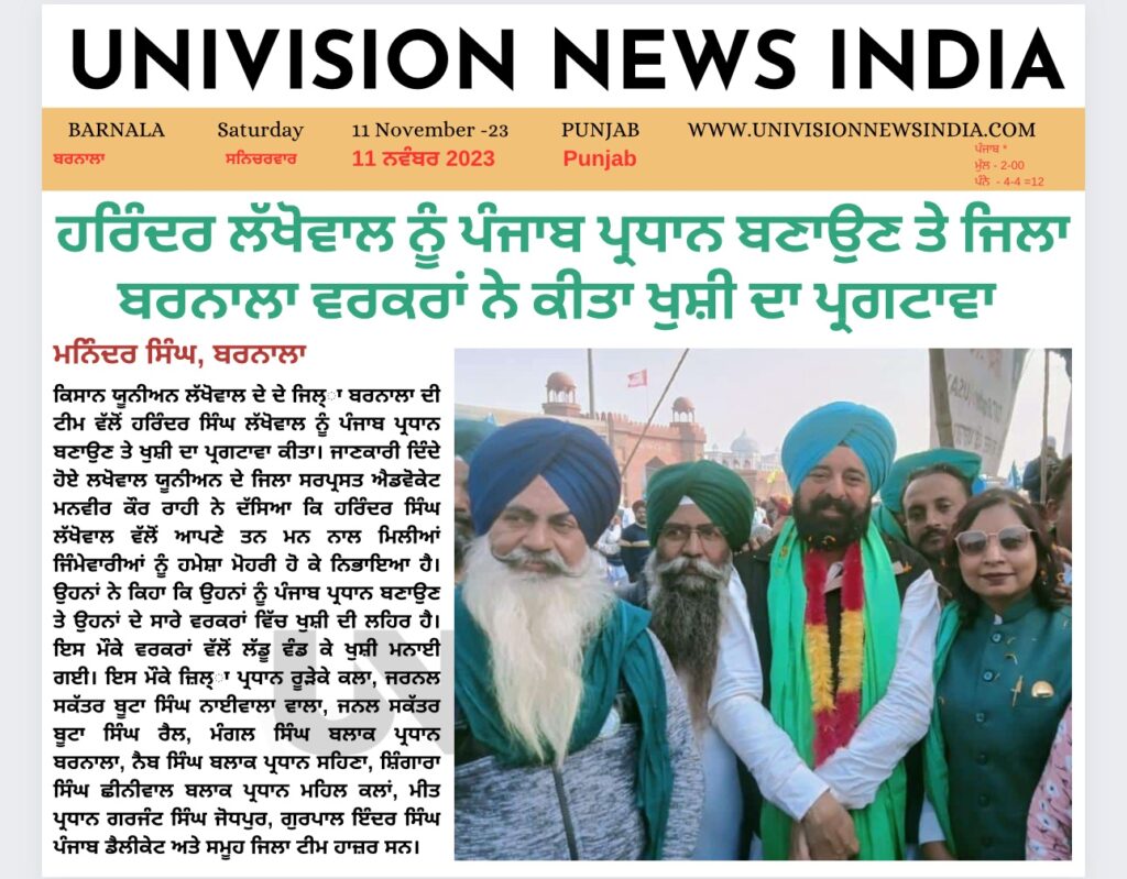 ਕਿਸਾਨ ਯੂਨੀਅਨ ਲੱਖੋਵਾਲ ਦੇ ਦੇ ਜਿਲ੍ਾ ਬਰਨਾਲਾ ਦੀ ਟੀਮ ਵੱਲੋਂ ਹਰਿੰਦਰ ਸਿੰਘ ਲੱਖੋਵਾਲ ਨੂੰ ਪੰਜਾਬ ਪ੍ਰਧਾਨ ਬਣਾਉਣ ਤੇ ਖੁਸ਼ੀ ਦਾ ਪ੍ਰਗਟਾਵਾ ਕੀਤਾ। ਜਾਣਕਾਰੀ ਦਿੰਦੇ ਹੋਏ ਲਖੋਵਾਲ ਯੂਨੀਅਨ ਦੇ ਜਿਲਾ ਸਰਪ੍ਰਸਤ ਐਡਵੋਕੇਟ ਮਨਵੀਰ ਕੌਰ ਰਾਹੀ ਨੇ ਦੱਸਿਆ ਕਿ ਹਰਿੰਦਰ ਸਿੰਘ ਲੱਖੋਵਾਲ ਵੱਲੋਂ ਆਪਣੇ ਤਨ ਮਨ ਨਾਲ ਮਿਲੀਆਂ ਜਿੰਮੇਵਾਰੀਆਂ ਨੂੰ ਹਮੇਸ਼ਾ ਮੋਹਰੀ ਹੋ ਕੇ ਨਿਭਾਇਆ ਹੈ। ਉਹਨਾਂ ਨੇ ਕਿਹਾ ਕਿ ਉਹਨਾਂ ਨੂੰ ਪੰਜਾਬ ਪ੍ਰਧਾਨ ਬਣਾਉਣ ਤੇ ਉਹਨਾਂ ਦੇ ਸਾਰੇ ਵਰਕਰਾਂ ਵਿੱਚ ਖੁਸ਼ੀ ਦੀ ਲਹਿਰ ਹੈ। ਇਸ ਮੌਕੇ ਵਰਕਰਾਂ ਵੱਲੋਂ ਲੱਡੂ ਵੰਡ ਕੇ ਖੁਸ਼ੀ ਮਨਾਈ ਗਈ। ਇਸ ਮੌਕੇ ਜ਼ਿਲ੍ਾ ਪ੍ਰਧਾਨ ਰੂੜੇਕੇ ਕਲਾ, ਜਰਨਲ ਸਕੱਤਰ ਬੂਟਾ ਸਿੰਘ ਨਾਈਵਾਲਾ ਵਾਲਾ, ਜਨਲ ਸਕੱਤਰ ਬੂਟਾ ਸਿੰਘ ਰੈਲ, ਮੰਗਲ ਸਿੰਘ ਬਲਾਕ ਪ੍ਰਧਾਨ ਬਰਨਾਲਾ, ਨੈਬ ਸਿੰਘ ਬਲਾਕ ਪ੍ਰਧਾਨ ਸਹਿਣਾ, ਸ਼ਿੰਗਾਰਾ ਸਿੰਘ ਛੀਨੀਵਾਲ ਬਲਾਕ ਪ੍ਰਧਾਨ ਮਹਿਲ ਕਲਾਂ, ਮੀਤ ਪ੍ਰਧਾਨ ਗਰਜੰਟ ਸਿੰਘ ਜੋਧਪੁਰ, ਗੁਰਪਾਲ ਇੰਦਰ ਸਿੰਘ ਪੰਜਾਬ ਡੈਲੀਕੇਟ ਅਤੇ ਸਮੂਹ ਜਿਲਾ ਟੀਮ ਹਾਜ਼ਰ ਸਨ।