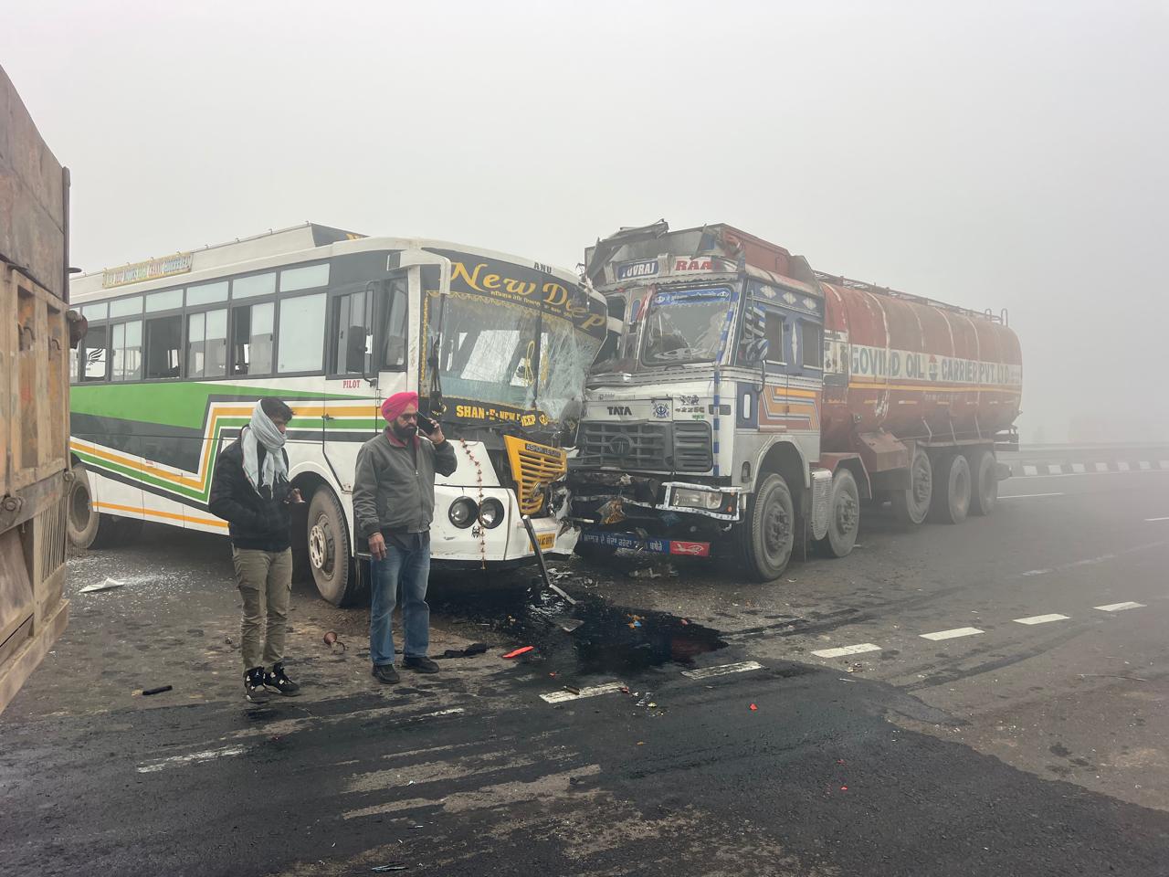 ਹਾਦਸੇ ਵਿਚ ਇਕ ਨਿੱਜੀ ਬੱਸ ਅਤੇ ਟੈਂਕਰ ਦੀ ਸਿੱਧੀ ਟੱਕਰ ਹੋਈ, ਜਿਸ ਕਾਰਨ ਕਰੀਬ ਡੇਢ ਦਰਜਨ ਸਵਾਰੀਆਂ ਦੇ ਜ਼ਖਮੀ ਹੋਣ ਦੀ ਗੱਲ ਸਾਹਮਣੇ ਆ ਰਹੀ ਹੈ। ਇਹ ਹਾਦਸਾ ਸੰਘਣੀ ਧੁੰਦ ਕਾਰਨ ਵਾਪਰਿਆ ਹੈ। ਜ਼ਖਮੀਆਂ ਨੂੰ ਵੱਖ-ਵੱਖ ਹਸਪਤਾਲਾਂ ਵਿਚ ਪਹੁੰਚਾਇਆ ਗਿਆ ਹੈ, ਜਿਥੇ ਉਨ੍ਹਾਂ ਦਾ ਇਲਾਜ ਚੱਲ ਰਿਹਾ ਹੈ।