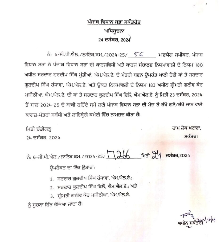 ਵਿਧਾਨ ਸਭਾ ਹਲਕਾ ਬਰਨਾਲਾ ਦੀ ਜਿਮਨੀ ਚੋਣ ਵਿੱਚ ਵਿਧਾਇਕ ਬਣੇ ਕਾਂਗਰਸੀ ਕੁਲਦੀਪ ਸਿੰਘ ਕਾਲਾ ਢਿੱਲੋ ਨੂੰ ਪੰਜਾਬ ਸਰਕਾਰ ਵੱਲੋਂ ਵਿਧਾਨ ਸਭਾ ਦੀਆਂ ਕਮੇਟੀਆਂ ਚ ਅਹਿਮ ਜਿੰਮੇਵਾਰੀ ਦਿੱਤੀ ਜਾ ਰਹੀ ਹੈ। ਪੰਜਾਬ ਵਿਧਾਨ ਸਭਾ ਦੇ ਸਪੀਕਰ ਕੁਲਤਾਰ ਸਿੰਘ ਸੰਧਵਾਂ ਵੱਲੋਂ ਜਾਰੀ ਹੁਕਮਾਂ ਅਨੁਸਾਰ ਕੁਲਦੀਪ ਸਿੰਘ ਕਾਲਾ ਢਿੱਲੋ ਵਿਧਾਨ ਸਭਾ ਦੀਆਂ ਦੋ ਕਮੇਟੀਆਂ ਪੰਜਾਬ ਅਸੈਂਬਲੀ ਕਮੇਟੀ ਅਤੇ ਸਬੋਰਡੀਨੇਟ ਲੈਜਿਸਲੇਸ਼ਨ ਦਾ ਮੈਂਬਰ ਨਾਮਜਦ ਕੀਤਾ ਗਿਆ ਹੈ।