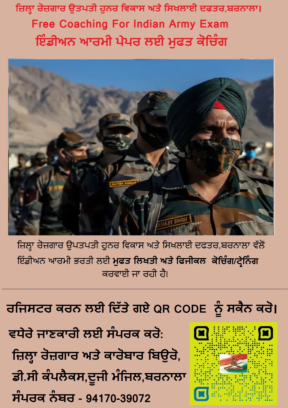 ਜਿੰਨ੍ਹਾਂ ਪ੍ਰਾਰਥੀਆਂ ਨੇ ਭਾਰਤੀ ਆਰਮੀ ਸੈਨਾ ਭਰਤੀ -2025 ਲਈ ਅਪਲਾਈ ਕੀਤਾ ਹੈ ਅਤੇ ਜਿਹੜੇ ਪ੍ਰਾਰਥੀ ਲਿਖਤੀ ਪ੍ਰੀਖਿਆ ਅਤੇ ਫਿਜੀਕਲ ਫਿਟਨੈਸ ਦੀ ਤਿਆਰੀ ਲਈ ਚਾਹਵਾਨ ਹਨ ਉਨ੍ਹਾਂ ਲਈ ਮੁਫਤ ਮੁਫਤ ਕੋਚਿੰਗ ਟ੍ਰੇਨਿੰਗ ਜ਼ਿਲ੍ਹਾ ਬਰਨਾਲਾ ਵਿਖੇ ਕਰਵਾਈ ਜਾ ਰਹੀ ਹੈ।