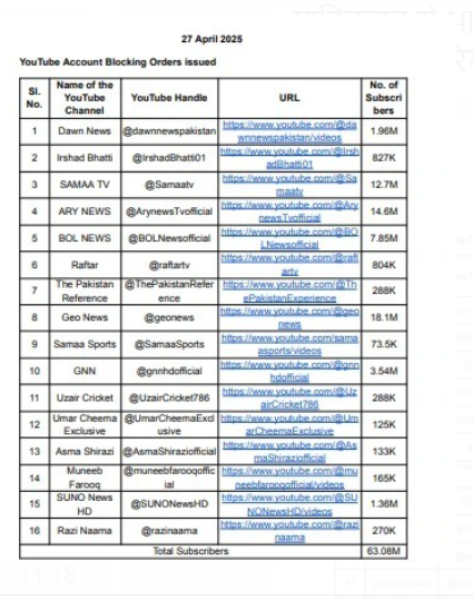 ਪਹਿਲਗਾਮ ਵਿੱਚ ਹੋਏ ਅਤਵਾਦੀ ਹਮਲੇ ਤੋਂ ਬਾਅਦ ਭਾਰਤ ਨੇ ਪਾਕਿਸਤਾਨ ਖਿਲਾਫ ਕਈ ਵੱਡੇ ਫੈਸਲੇ ਲਏ ਹਨ ਤੇ ਲਗਾਤਾਰ ਪਾਕਿਸਤਾਨ ਵਿਰੁੱਧ ਕਾਰਵਾਈ ਕੀਤੀ ਜਾ ਰਹੀ ਹੈ। ਹੁਣ ਭਾਰਤ ਨੇ ਪਾਕਿਸਤਾਨ ਖਿਲਾਫ ਡਿਜੀਟਲ ਕਾਰਵਾਈ ਕਰਦੇ ਹੋਏ 16 ਯੂਟਿਊਬ ਚੈਨਲਾਂ ਉਤੇ ਪਾਬੰਦੀ ਲਾ ਦਿੱਤੀ ਹੈ। ਜਾਣਕਾਰੀ ਅਨੁਸਾਰ ਇਸ ਸੂਚੀ ਵਿੱਚ ਡਾਨ ਨਿਊਜ਼, ਸਮਾ ਟੀਵੀ, ਆਰੀਆ ਨਿਊਜ਼, ਜੀਓ ਨਿਊਜ਼ ਸਮੇਤ 16 ਪਾਕਿਸਤਾਨੀ ਯੂਟਿਊਬ ਚੈਨਲਾਂ ਉਤੇ ਪਾਬੰਦੀ ਲਗਾਈ ਗਈ ਹੈ। ਸਰਕਾਰ ਨੇ ਇਹ ਪਾਬੰਦੀ ਜੰਮੂ-ਕਸ਼ਮੀਰ ਵਿੱਚ ਪਹਿਲਗਾਮ ਅਤਵਾਦੀ ਹਮਲੇ ਦੇ ਪਿਛੋਕੜ ਵਿੱਚ ਭਾਰਤ, ਇਸ ਦੀਆਂ ਹਥਿਆਰਬੰਦ ਸੈਨਾਵਾਂ ਅਤੇ ਸੁਰੱਖਿਆ ਏਜੰਸੀਆਂ ਵਿਰੁੱਧ ਭੜਕਾਊ ਅਤੇ ਫਿਰਕੂ ਤੌਰ ‘ਤੇ ਸੰਵੇਦਨਸ਼ੀਲ ਸਮੱਗਰੀ, ਝੂਠੇ ਅਤੇ ਗੁੰਮਰਾਹਕੁੰਨ ਬਿਆਨਾਂ ਅਤੇ ਗਲਤ ਜਾਣਕਾਰੀ ਫ਼ੈਲਾਉਣ ਲਈ ਲਗਾਈ ਹੈ। ਸਰਕਾਰ ਨੇ ਸਿੰਧੂ ਜਲ ਸੰਧੀ ਨੂੰ ਵੀ ਮੁਅੱਤਲ ਕਰ ਦਿੱਤਾ ਹੈ, ਪਾਕਿਸਤਾਨੀ ਵੀਜ਼ੇ ਰੱਦ ਕਰ ਦਿੱਤੇ ਹਨ ਅਤੇ ਹਾਈ ਕਮਿਸ਼ਨ ਵਿੱਚ ਸਟਾਫ਼ ਵੀ ਘਟਾ ਦਿੱਤਾ ਹੈ। ਇਸ ਦੌਰਾਨ, ਪਾਕਿਸਤਾਨੀ ਮੀਡੀਆ ਭਾਰਤ ਬਾਰੇ ਅਫਵਾਹਾਂ ਫੈਲਾ ਰਿਹਾ ਸੀ, ਜਿਸ ਕਾਰਨ ਸਰਕਾਰ ਨੇ ਪਾਕਿਸਤਾਨੀ ਮੀਡੀਆ ਦੇ ਸੋਸ਼ਲ ਮੀਡੀਆ ਅਕਾਊਂਟਸ ‘ਤੇ ਬੈਨ ਲਗਾ ਦਿੱਤਾ ਹੈ। ਹੁਣ ਭਾਰਤ ਵਿੱਚ ਕੋਈ ਵੀ ਪਾਕਿਸਤਾਨੀ ਮੀਡੀਆ ਚੈਨਲ ਨਹੀਂ ਦਿਖਾਇਆ ਜਾਵੇਗਾ। ਇਸ ਤੋਂ ਪਹਿਲਾਂ ਭਾਰਤ ਸਰਕਾਰ ਨੇ ਪਾਕਿਸਤਾਨ ਸਰਕਾਰ ਦੇ ਅਧਿਕਾਰਤ ਟਵਿੱਟਰ ਅਕਾਊਂਟ ‘ਤੇ ਵੀ ਪਾਬੰਦੀ ਲਗਾ ਦਿੱਤੀ ਸੀ।
