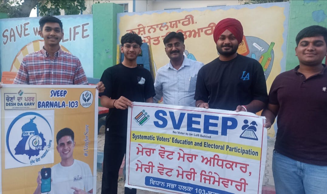 ਜ਼ਿਲ੍ਹਾ ਚੋਣ ਅਫ਼ਸਰ ਕਮ ਡਿਪਟੀ ਕਮਿਸ਼ਨਰ ਬਰਨਾਲਾ  ਪੂਨਮਦੀਪ ਕੌਰ ਦੇ ਦਿਸ਼ਾ ਨਿਰਦੇਸ਼ ਅਧੀਨ ਰਿਟਰਨਿੰਗ ਅਫ਼ਸਰ ਬਰਨਾਲਾ ਕਮ ਐੱਸ.ਡੀ.ਐੱਮ ਬਰਨਾਲਾ  ਵਰਿੰਦਰ ਸਿੰਘ ਦੀ ਅਗਵਾਈ ਹੇਠ  ਵਿਨਸੀ ਜਿੰਦਲ ਸਵੀਪ ਨੋਡਲ ਬਰਨਾਲਾ 103 ਅਤੇ ਸਵੀਪ ਟੀਮ ਨੇ ਵੱਖ ਵੱਖ ਸਕੂਲਾਂ ਦੇ ਵਿਦਿਆਰਥੀਆਂ , ਸਵੀਪ ਇੰਚਾਰਜਾਂ ਦੀ ਮੱਦਦ ਨਾਲ ਲੋਕਾਂ ਨੂੰ ਪਹਿਲੀ ਜੂਨ ਨੂੰ ਹੋਣ ਵਾਲੀਆਂ ਲੋਕ ਸਭਾ ਚੋਣਾਂ ਵਿੱਚ ਵੱਧ ਚੜ ਕੇ ਭਾਗ ਲੈਣ ਲਈ ਪ੍ਰੇਰਿਤ ਕੀਤਾ।