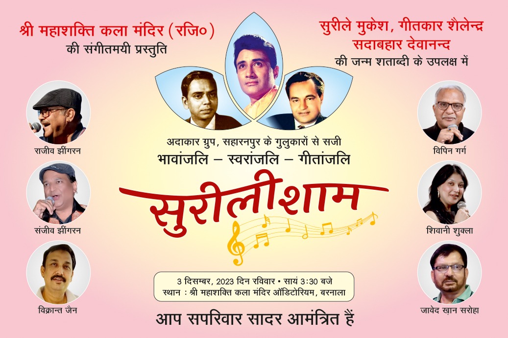 ਸ੍ਰੀ ਮਹਾਂ ਸ਼ਕਤੀ ਕਲਾ ਮੰਦਿਰ, ਬਰਨਾਲਾ ਵੱਲੋਂ ਪ੍ਰਸਿਧ ਗੀਤਕਾਰ ਸ਼ੈਲੰਦਰ ਸਦਾ ਬਹਾਰ ਅਭਿਨੇਤਾ ਦੇਵਾਨੰਦ ਅਤੇ ਗਾਇਕ ਮੁਕੇਸ਼ ਦੀ ਜਨਮ ਸਤਾਬਦੀ ਨੂੰ ਸਮਰਪਿਤ ਪੁਰਾਣੇ ਸਦਾ ਬਹਾਰ ਫਿਲਮੀ